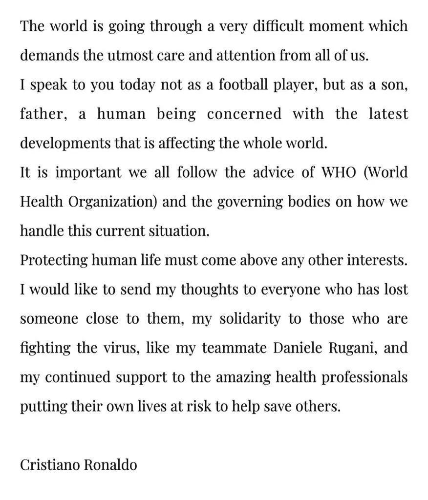 足球方面, C羅作為影響力巨大的球星,自然也是親力親為,呼籲大家注意保護自己。