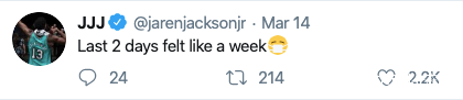 沒有比賽的日子總是難熬的,灰熊隊球員杰倫·傑克遜就發推特表示: 過去兩天感覺像過了一個周。