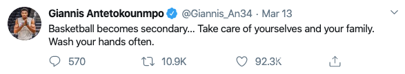 字母哥則是勸大家稍安勿躁—— 在當下特殊時期,籃球只是第二位的,大家一定要保護好自己和家人,並且,多洗手!