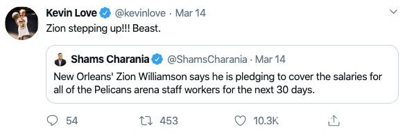 之前,他宣佈將承擔未來30天,鵜鶘主場所有工作人員的薪水,還得到了樂福叔叔的點名表揚。