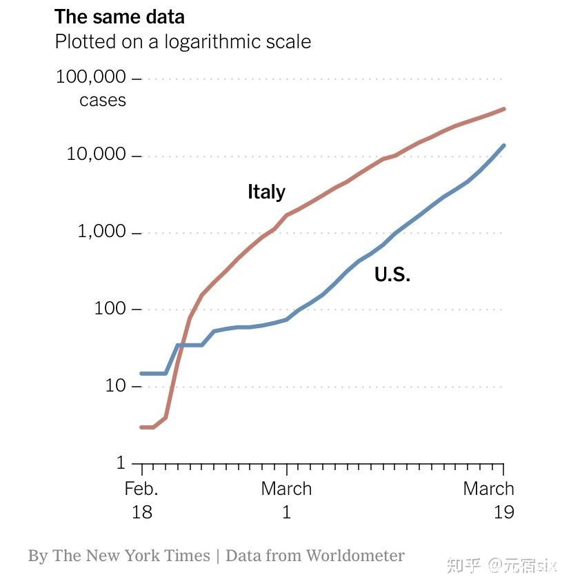 而且,如果把線性模型改成指數模型,更能直觀地看出增長速率在減緩,反而是美國在每天地翻倍。