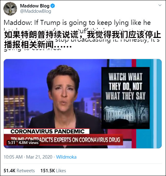 同日,雷切爾呼籲,如果總統再在關於疫情的問題上撒謊的話,記者們應該停止播報此類新聞。