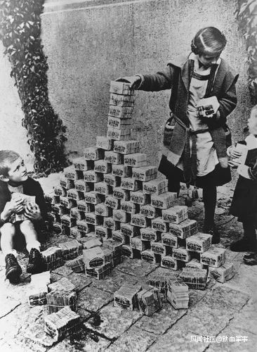 德國政府在1920年2月6日發行的紙幣還是10面額的,而到了四年後的1924年2月15日,發行的紙幣面額已經是100萬億了。通貨膨脹之嚴重,以至於當時的德國小孩甚至在街邊拿錢當積木玩, 一條麪包的成本甚至高達1000億馬克。