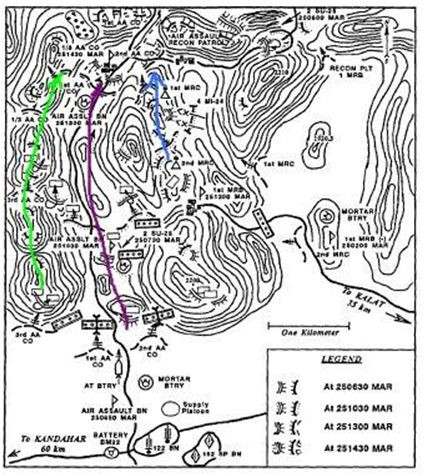 摩步1營和空中突擊連都在連一級配屬了炮兵彈着觀察員。1營還有一個空地協調組。1營和3連都攻佔了制高點並向北部其餘高地躍進(譯註:請見圖中標識的綠色和蘭色線)。通過這種方式,他們始終能夠支持谷地中的空中突擊營向北推進(注:圖中的紫色線)。