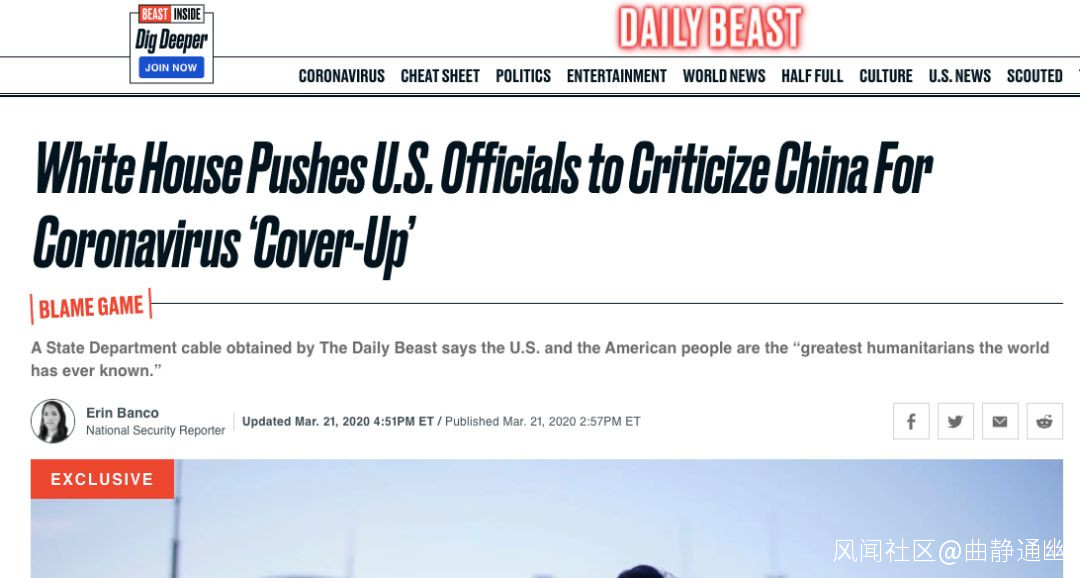 甩鍋給中國一直是美國政客應對批評聲音時屢試不爽的一招。 當然,西方媒體也意識到了這一點。《每日野獸網》毫不留情地揭露了特朗普的小算盤:美國政府在向公眾傳達關鍵衞生領域信息的同時,也在試圖轉移國內對自己應對疫情不力和內部不和的指責。