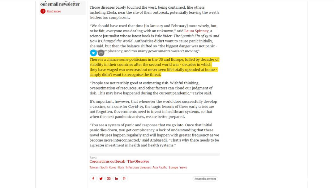 很多媒體開始思考這樣一個問題:為什麼中國、韓國等一些亞洲國家都控制住了疫情,而西方國家卻束手無策。《衞報》在一篇報道中給出了自己的解釋:二戰以來的幾十年時間裏,美國和歐洲雖然在海外發起過戰爭,但是本土卻一直保持穩定的局勢。西方政客被此矇蔽,單純不願意承認危機的存在。