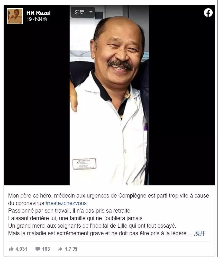 這位醫生的兒子在其社交網上發文“我的父親,這位英雄,貢比涅市(Compiègne)醫療中心急救科醫生因新冠病毒去世。”