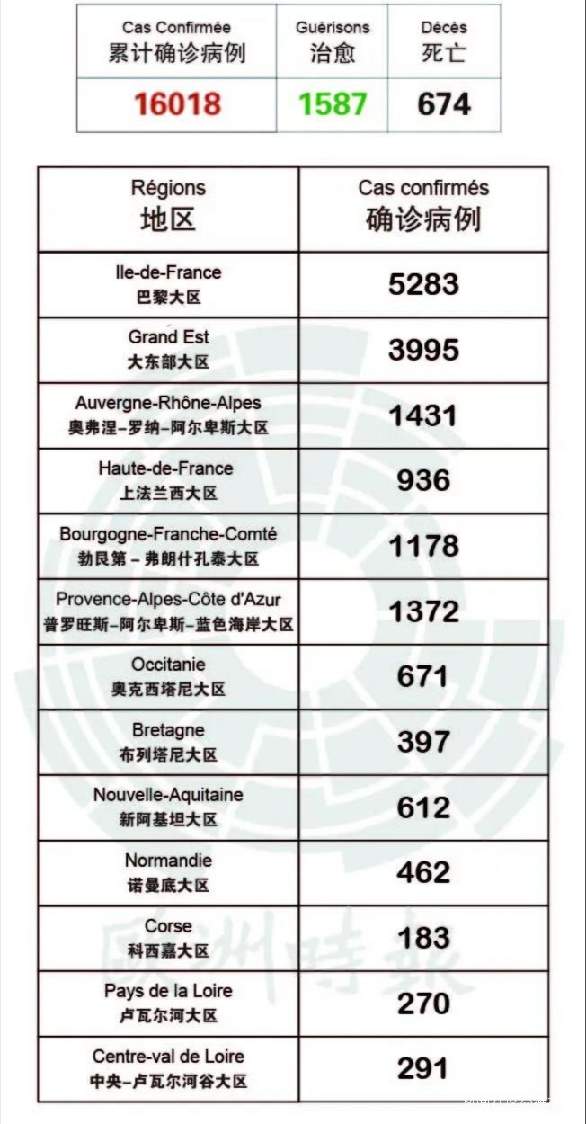 22日,法國新增1559例,累計16018例,新增死亡112例,累計死亡674人。