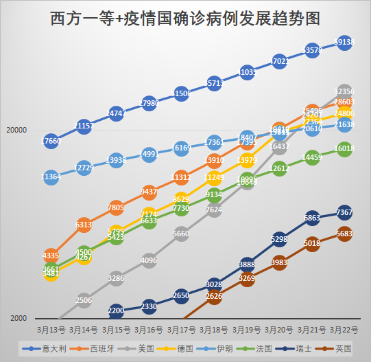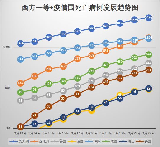 西班牙、德國、瑞士、法國和英國五個國家今天的增數和增速都有明顯下降。這就不好説都是偶然意外或另有隱情了。這些國家,都沒有執行儘量檢測的政策,它們的確診數目,和那些努力檢測的國家,已經不可比。但是以前説過,只要口徑一直一致,這樣的縮了水的數據還是可以用來觀察變動趨勢的。我們把這些數字看做抽樣調查的結果就行。