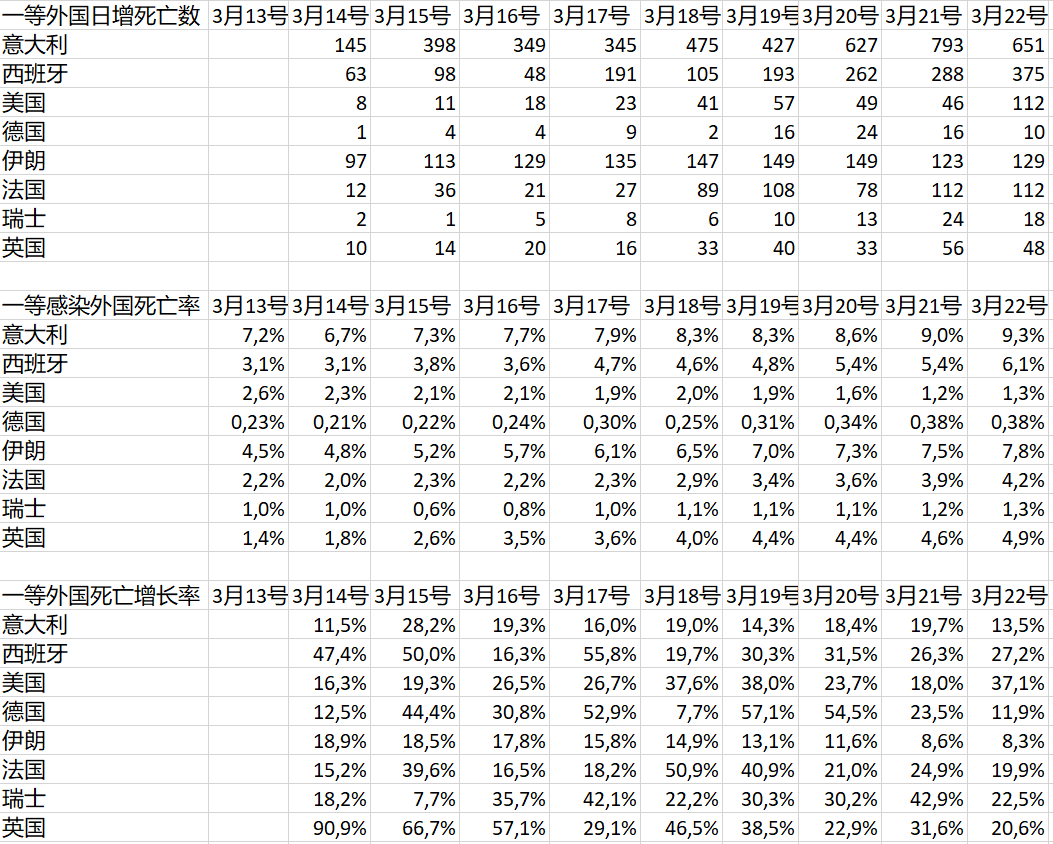 第一個表是每日新增死亡數,第二個表是死亡率(累計死亡/累計確診),第三個表是死亡數的增長率(今天死亡/昨天-1再乘100%)。從這裏可以看到,和新增確診一樣,意大利今天的新增死亡人數新增死亡人數比率也開始下降。如果這個數字以後也能與新增確診並行下降,那昨天是峯值就可以進一步確認了。