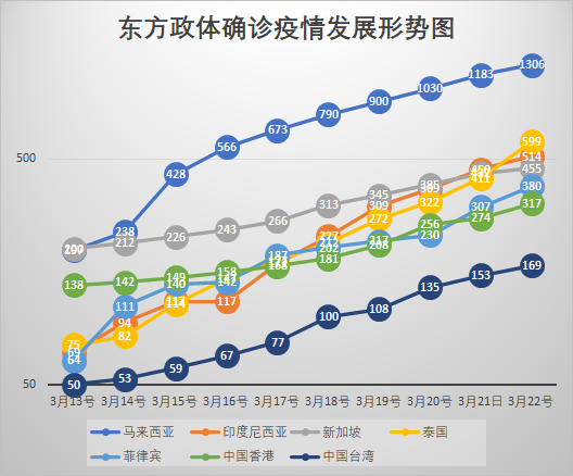 最後來看東方的情形。七個重點觀察對象中,也有五個在降速增長。最危險的今天是泰國。其次是菲律賓和印尼還有危險。香港、台灣、新加坡總是沒有大危險的,就等着哪天可以退場。馬來西亞似乎也穩住了,大概不會爆發了。