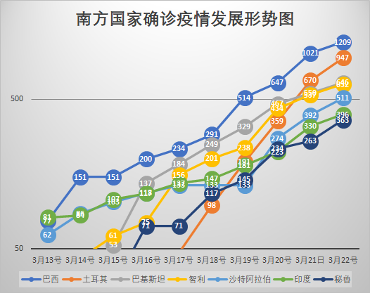 現在來看南方國家的情形。七支隊伍中,增速下降的居然有六支。尤其土耳其的增速已經下降一半。雖然增速依然瘋狂,但如果明天再降速,就不那麼可怕了。印度的增速也腰斬,希望明天繼續。沙特阿拉伯的增速也在下降,請繼續。只有秘魯在劇增,希望很快有轉機。