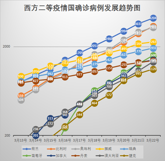 丹麥已經持續很長時間低增長,很快就可以達到退場的標準了。它的頂部已經可以預測,就是怎麼也到不了2000吧 。丹麥的第一個峯值時確診618人,現在1392。618 x 3 =1854。作為預期頂部倒是蠻合適。