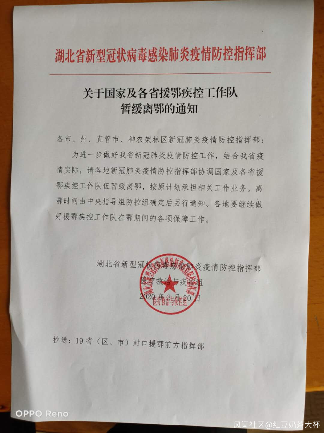 坊間傳出一份“關於國家及各省援鄂疾控工作隊暫緩離鄂的通知”,要求離鄂時間由中央指導組防控組確定後另行通知。