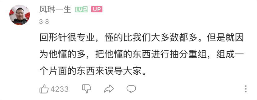 在視頻下方的評論中,@風琳一生 説,回形針很專業,懂的比我們大多數都多。但是就因為他懂的多,把他懂的東西進行抽分重組,組成一個片面的東西來誤導大家。