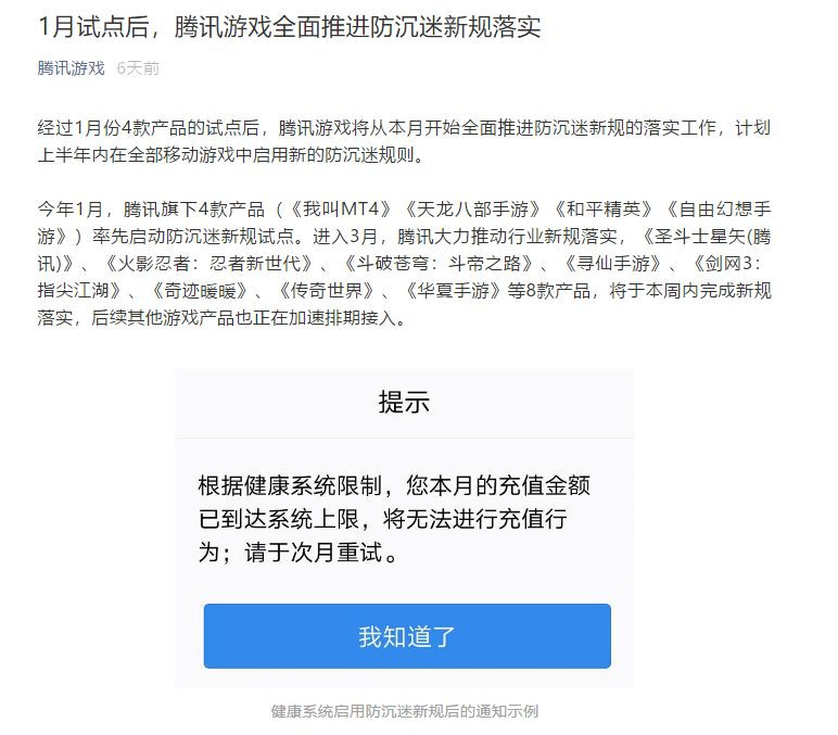 3月17日,騰訊遊戲在其官方微信公眾號發佈公告稱,經過4款產品的試點後,騰訊將從本月開始全面推進防沉迷新規的落實工作,計劃上半年內在全部移動遊戲中啓用新的防沉迷規則。