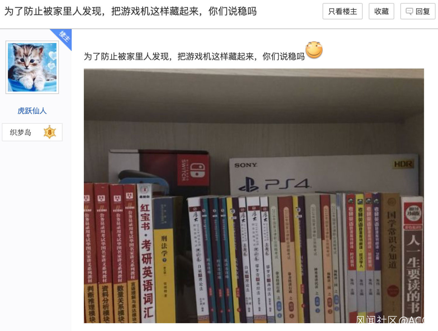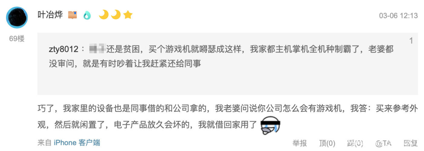 “除了把PS4偽裝成路由器外,現在在網絡上還出現了把XBOX偽裝機頂盒,把Switch偽裝成健身器的説法。有人還會在面對家人質疑的時候低報價格……看起來簡直就是滿滿的求生欲。”
