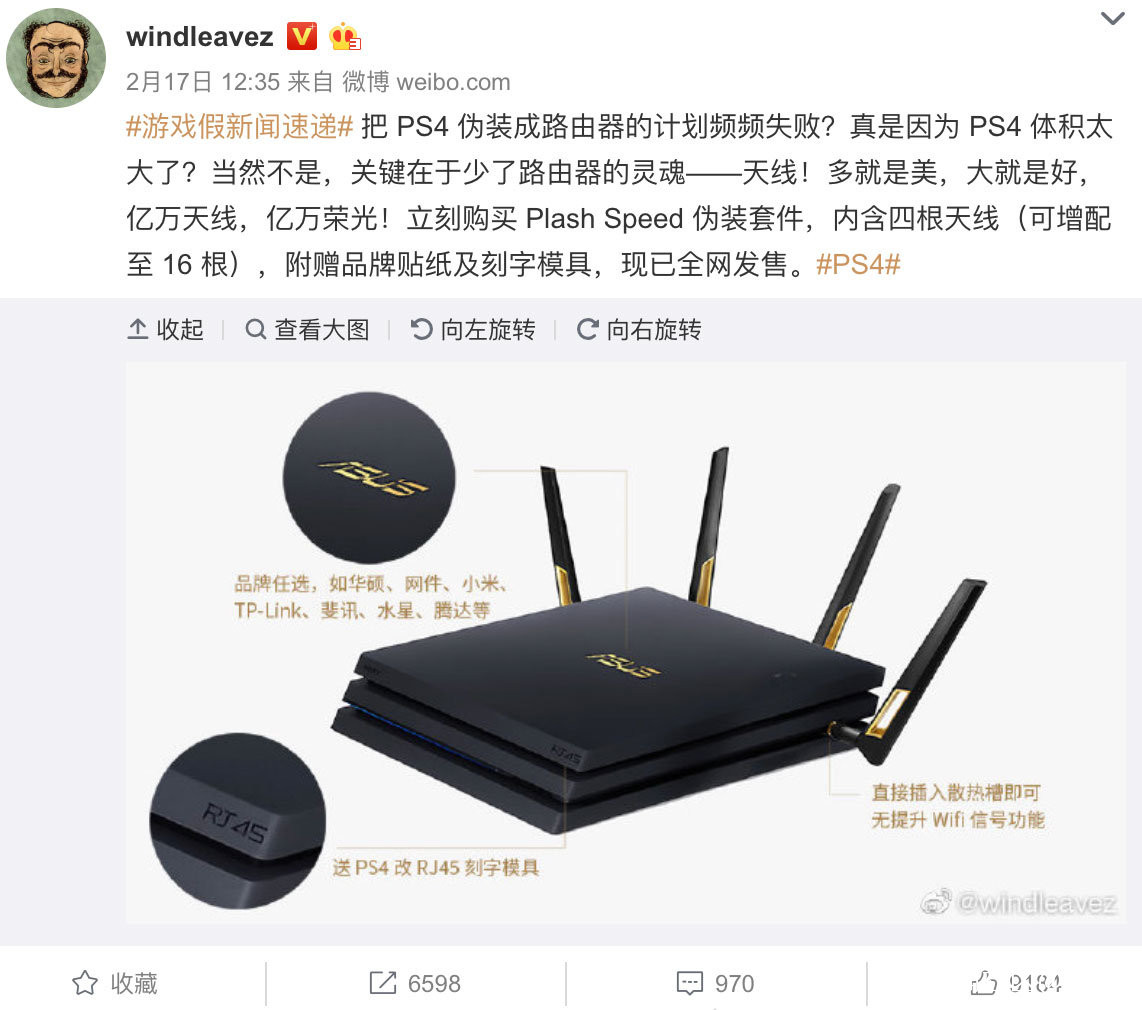有趣的是,知名假遊戲新聞播報員“windleavez”機智地發現,要把PS4偽裝成路由器,關鍵還是需要購買一份“Plash Speed 偽裝套件”。