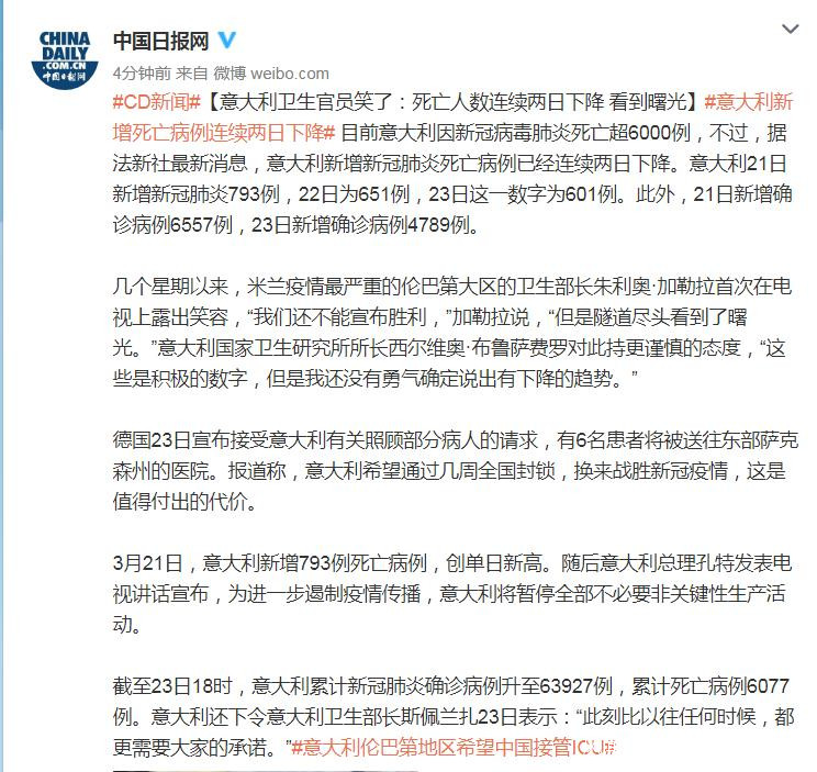 125人蔘與22評論目前意大利因新冠病毒肺炎死亡超6000例,不過,據法新社最新消息,意大利新增新冠肺炎死亡病例已經連續兩日下降。意大利21日新增新冠肺炎793例,22日為651例,23日這一數字為601例。此外,21日新增確診病例6557例,23日新增確診病例4789例。