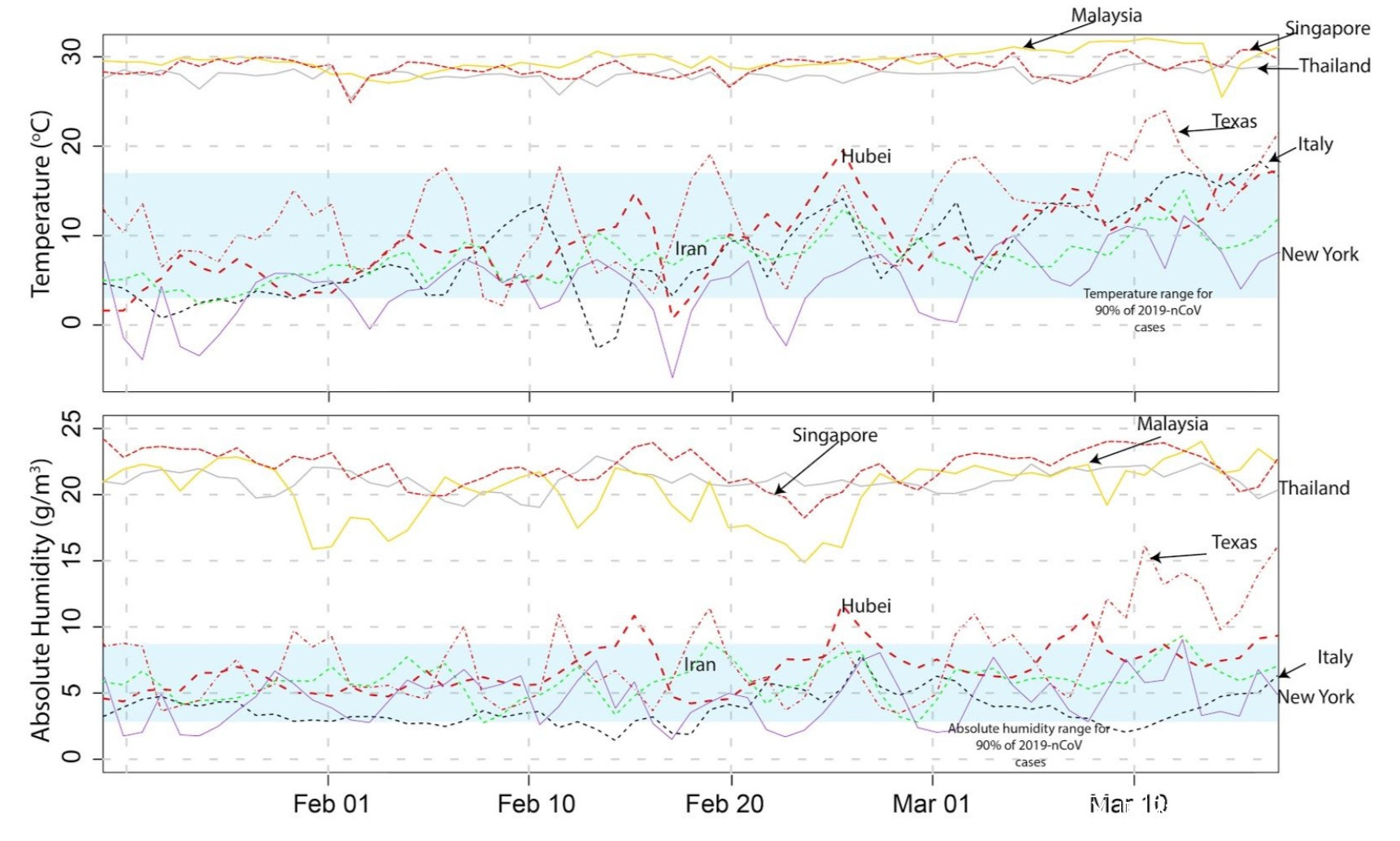 新冠疫情影響地區温度和絕對濕度隨時間的變化。温度和絕對濕度較高的地區(新加坡和泰國)報告的新冠病例較少。疫情大流行的中心湖北以紅色虛線表示。大部分新冠病例(>90%)的温度和絕對濕度範圍以淡藍色突出顯示,温度在3℃-17℃之間,絕對濕度在4g/m3-8g/m3之間。