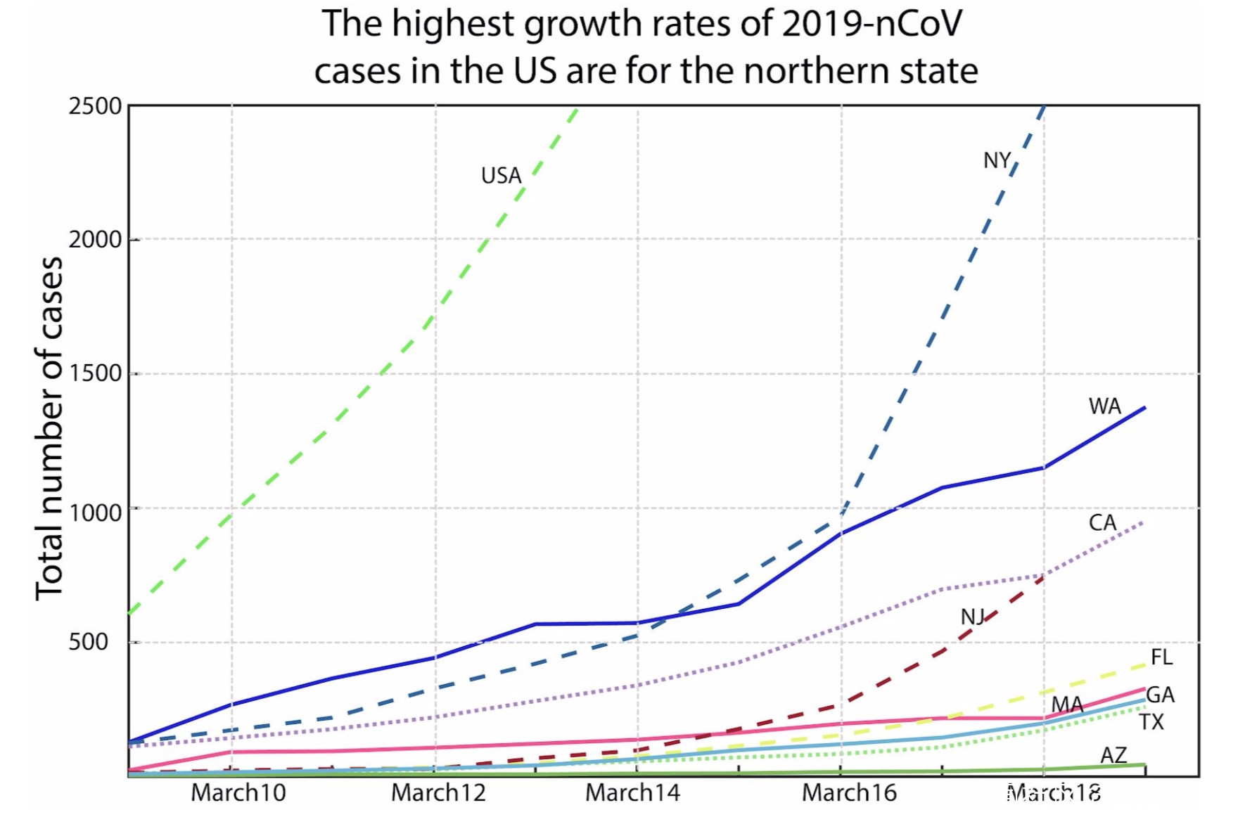 美國各州新冠病例增長曲線(截至2020年3月19日)。數字顯示的是3月9日至3月19日期間的總病例數。不同的地區和州的增長曲線明顯不同。