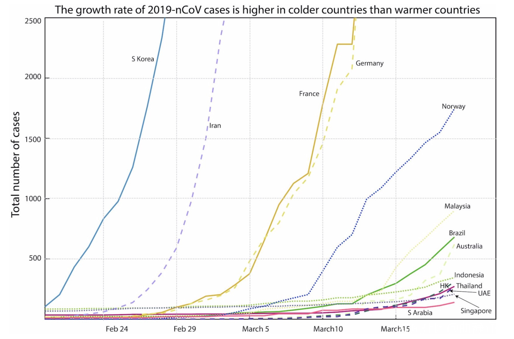 目前來看,意大利、伊朗和韓國的增長率較高,這些國家表現出和疫情暴發地中國武漢類似的天氣模式,即它們在2月至3月的平均温度在3℃-10℃。相反,氣候較為温暖潮濕的國家,如新加坡、馬來西亞、泰國和其他東南亞國家的增長率較低。
