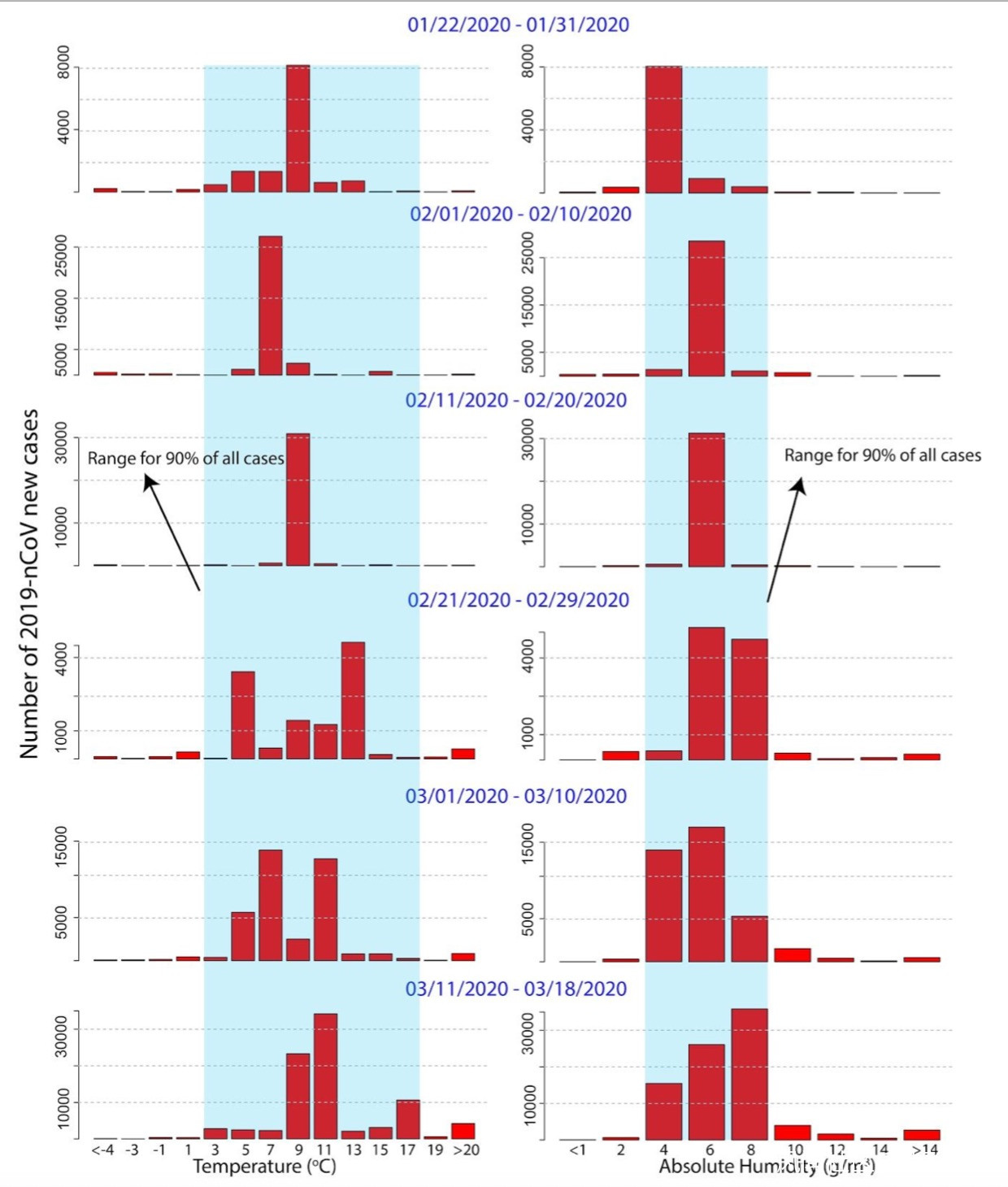 Bukhari等人的分析顯示,從2020年1月22日到2020年3月19日,平均氣温在4℃-10℃之間,絕對濕度在3 g/m3-9g/m3之間的地區,每10天新增病例最多。除了新增病例,温度高於11℃和低於0℃的地區總病例數小於5%,絕對濕度大於9g/m3的總病例數則小於10%。