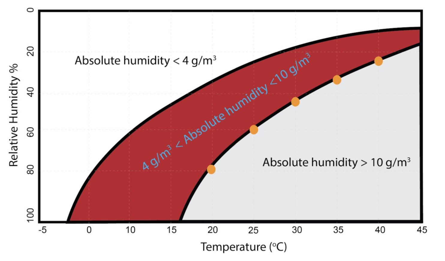 研究人員計算了温度在-5℃-40℃、相對濕度(RH)在0-100%之間的理論絕對濕度。氣温低於15℃地區的絕對濕度小於 9g/m3。温度在15-25℃之間時,絕對濕度如果要小於9g/m3,則相對濕度必須要大於60%。