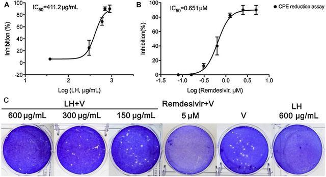 A、B分別為連花清瘟與瑞德西韋的抑制曲線。C為連花清瘟對新冠病毒的空斑減數實驗