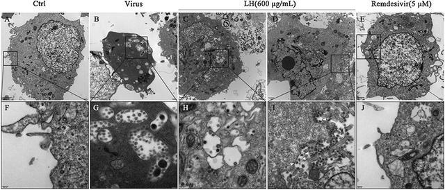 電子顯微鏡下超薄細胞切片。AF為未感染細胞,BG為新冠感染細胞,CDHI為連花清瘟處理細胞,EJ為瑞德西韋處理細胞。
