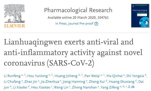 相關論文題為《連花清瘟對新型冠狀病毒具有抗病毒、抗炎作用》“Lianhuaqingwen exerts anti-viral and anti-inflammatory activity against novel coronavirus (SARS-CoV-2)”,已被《藥理學研究》期刊(Pharmacological Research)接收。