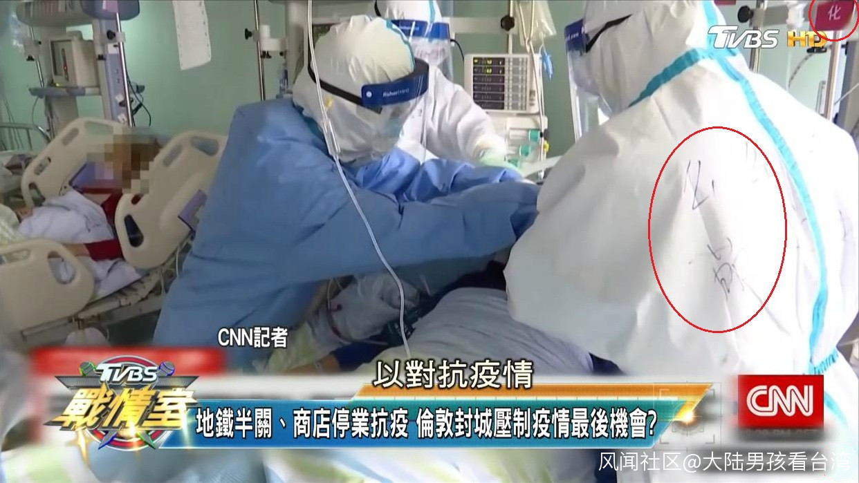 雖然畫面只有短短不過數秒,但是還是可以注意到其間出現的醫護人員,他們所穿的防護服上隱隱約約寫的是中文名字,視頻右上角也出現了一個“化”字。