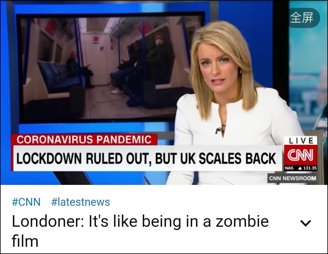 原視頻的標題為《Londoner:It’s like being in a zombie film》,可以翻譯為“倫敦人:就像是一部殭屍電影一樣”。