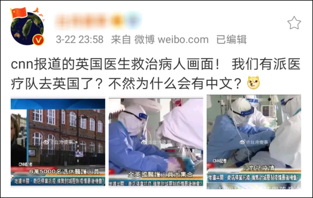 還有其他的可能性則是,整個欄目組刻意為之,不知出於何種目的將大陸醫院的場景嫁接到英國抗疫的介紹視頻中。不怪乎大陸網友會感嘆:我們有派醫療隊到英國支援去了?