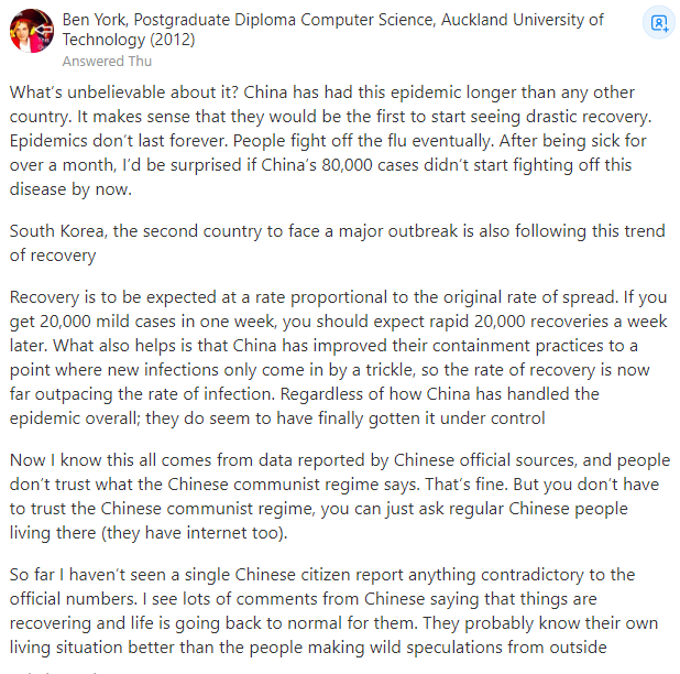 有什麼難以置信的?中國與這種病毒鬥爭的歷史比任何其他國家都要長得多。他們將是第一個開始看到經濟大幅復甦的國家,這是有道理的。流行病不會永遠持續下去,人們將最終戰勝它。在病毒出現一個多月後,如果中國的8萬個病例到現在還沒有開始解決這種疾病,我會感到驚訝。