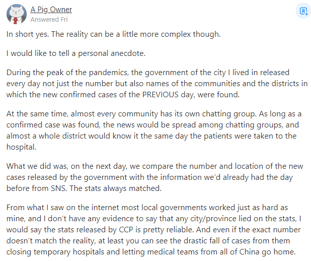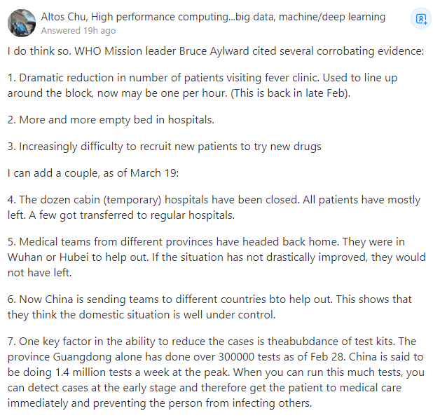 到目前為止,我還沒有看到一箇中國公民報告任何與官方數字相矛盾的事情。我看到很多中國人的評論説,他們的生活正在恢復正常。他們可能比那些在外面胡思亂想的人更瞭解自己的生活狀況。