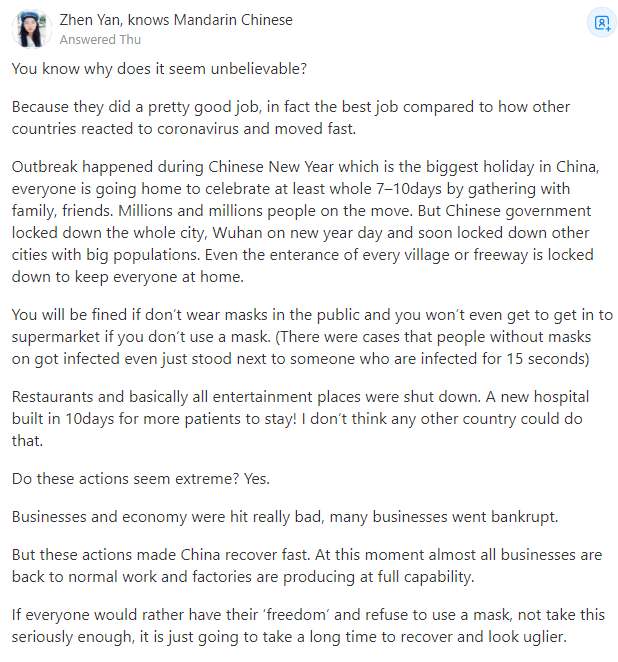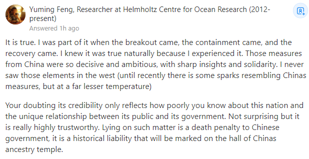 這是真的。爆發,遏制,復甦,我就是其中的一員。我知道這真的因為我經歷過。中國的這些措施是如此果斷和雄心勃勃,具有敏鋭的洞察力和團結精神。我從未在西方看到過這些積極因素(直到最近才有一些類似中國措施的火花,但温度要低得多)。