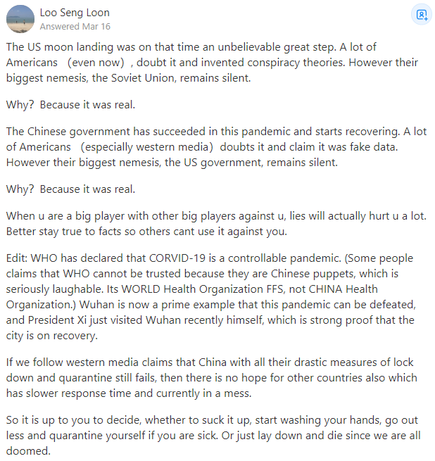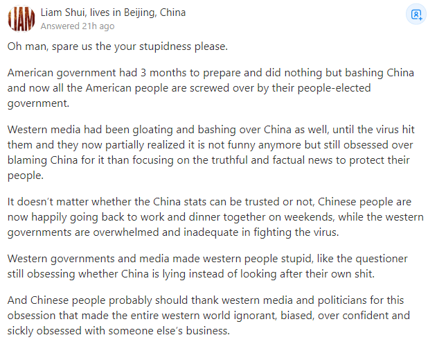 西方政府和媒體讓西方人變得愚蠢,就像發問者仍然在糾結中國是否在撒謊,而不是照顧他們自己的狗屎。