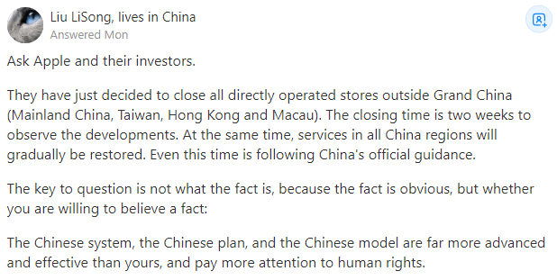換言之,中國為什麼要在這件事上撒謊?如果他們撒謊的話,很容易反駁,所有的封Suo都會被視為浪費時間和金錢。