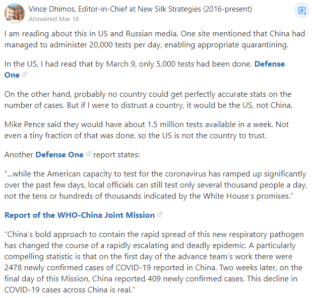 我在美國和俄羅斯的媒體上看到了這一點。一個網站提到,中國已經設法每天進行2萬次檢測,實現了適當的隔離。