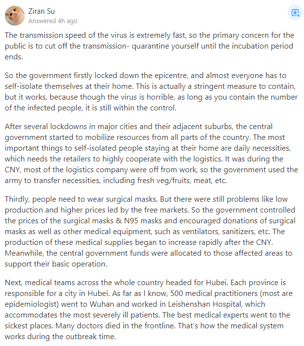 接下來,全國醫療隊開往湖北。每個省負責湖北的一個城市。據我所知,有500名醫生(大多數是流行病學家)到武漢雷神山醫院工作,那裏收容了最嚴重的病人。最好的醫學專家去最嚴重的地方。許多醫生死在前線,這就是爆發期間醫療系統的運作方式。