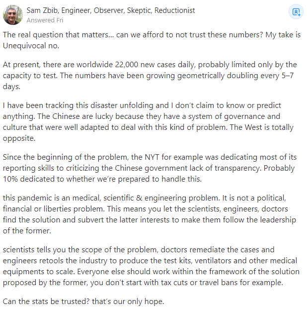 我一直在追蹤這場災難的發展,但我並不聲稱知道或能預測任何事情。中國人之所以幸運,是因為他們有一套很好地適應了這種問題的治理體系和文化,而西方則完全相反。