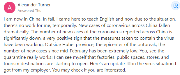 我現在就在中國。去年秋天,我來這裏教英語,現在由於這種情況,我暫時沒有工作。中國新的冠狀病毒病例急劇下降。中國各地報告的冠狀病毒新病例數量下降很明顯,這是一個非常積極的跡象,表明為遏制病毒而採取的措施一直在起作用。在爆發疫情的震中湖北省以外,2月中旬以來新發病例數量極低。你看,隔離真的管用!我可以看到工廠,公共空間,商店和旅遊目的地慢慢開始開放。這是我從僱主那裏得到的最新病毒情況,你可以看看你是否感興趣。