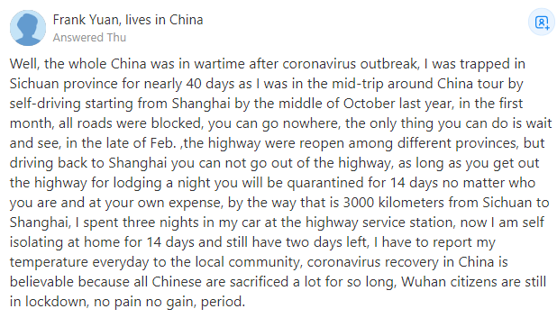 嗯,冠狀病毒爆發後,整個中國都處於戰時狀態,我在四川省被困了將近40天。因為去年10月中旬,我在環遊中國的途中,自駕車從上海出發。一月份,所有的道路都被堵住了,你哪兒也去不了,你唯一能做的就是等着看看2月下旬能否通車。後來這條高速公路在不同省份之間重新開通,但開車回上海,你不能出高速公路,只要你出高速公路住宿一晚,無論你是誰,都將被隔離14天,費用由你自己承擔。順便説一下從四川到上海3000公里,我在高速公路服務區的車裏花了3個晚上,我已經在家裏自我隔離了14天,還有兩天就滿了,我每天都要向當地社區報告我的體温。中國的冠狀病毒恢復數字是可信的,因為所有的中國人都犧牲了這麼久。現在武漢市民仍然處於禁閉狀態,沒有痛苦就沒有收穫。