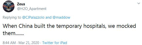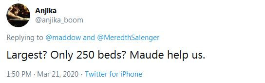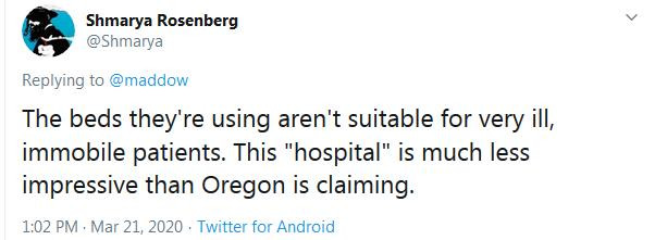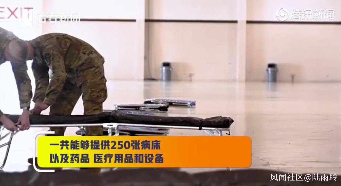 次日,美國參謀長聯席會議主席馬克·米利(Mark A. Milley)表示,軍方將於72小時內在紐約和西雅圖建立“方艙醫院”,每座醫院各有248個牀位,各配有11台呼吸機。除這兩座醫院外,還有一些軍方的醫療設施待命部署。