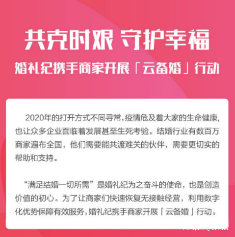 看到結婚行業面臨的危機和困境,婚禮紀迅速推出“雲備婚”行動,打出一套抗疫“組合拳”,則非常實際性地幫助到了疫情期間許多商家。
