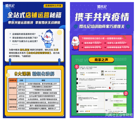 在開工第一週,婚禮紀犀牛學院專門針對疫期經營的十幾場公益直播培訓課程開始落地,對於疫情下線上店鋪運營、新人溝通以及客户追蹤等結婚商家最關注的領域,一一給出實質性的指導方案或操作技巧,吸引數萬商家參與,每一場均爆滿,許多商家發自內心的表達感激。
