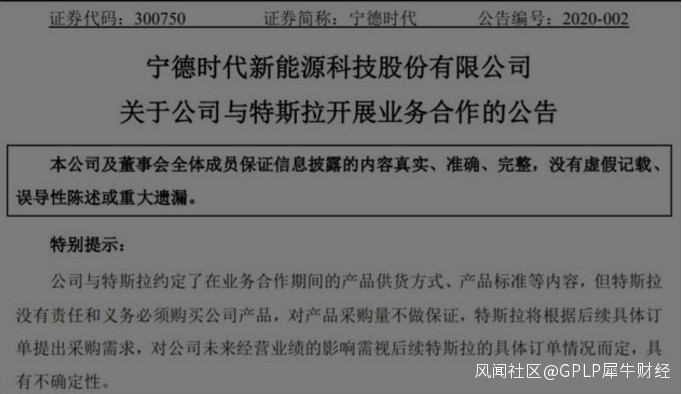 據公開消息顯示,新能源電池生產商寧德時代2月與特斯拉達成協議,將在2020年7月1日至2022年6月30日為特斯拉供應電池。但寧德時代聲明這份協議對特斯拉而言並不具備約束力,既不表示特斯拉只能以寧德時代為唯一供貨商,也不承諾採購量的多少。