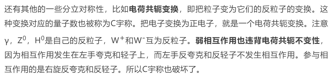這樣的變換不能由一個連續的參數來表達,因此是分立的。這種對稱性產生一個守恆的量子數,稱為宇稱。1957年,李政道和楊振寧發現,強相互作用和電磁相互作用中宇稱守恆,弱相互作用中宇稱破壞。這是什麼意思?其實後來的實驗發現參與弱相互作用的粒子其實都是左手粒子。理解這個物理現象需要深入理解空間翻轉變換的對稱性。