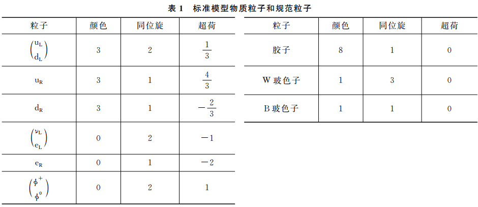 格拉肖、薩拉姆和温伯格三位物理學家構建了電弱統一理論,在理論中物質粒子的規範對稱性如表1左表所示,規範粒子規範對稱性**[21****]**如表1右表所示。注意這些粒子與圖1中的粒子並不完全相同:夸克和輕子被分成左手和右手粒子,左手粒子構成了同位旋二重態,右手是單態;夸克還是顏色的三重態,而輕子是顏色的單態;φ場就是希格斯場,它們是同位旋二重態。每個場分量是複數的,因此總共有4個標量自由度。在右表中,規範粒子都是規範變換羣的伴隨表示,膠子是顏色八重態,同位旋單態;而W玻色子是顏色單態,同位旋三重態;B玻色子是顏色單態,同位旋單態。另外,還需要注意的是,標準模型中沒有右手中微子。物理學家構建標準模型理論時,還沒有明確中微子有靜止質量的實驗。因此,最自然的選擇就是中微子靜止質量為零,這樣中微子只有一種手徵態即可。